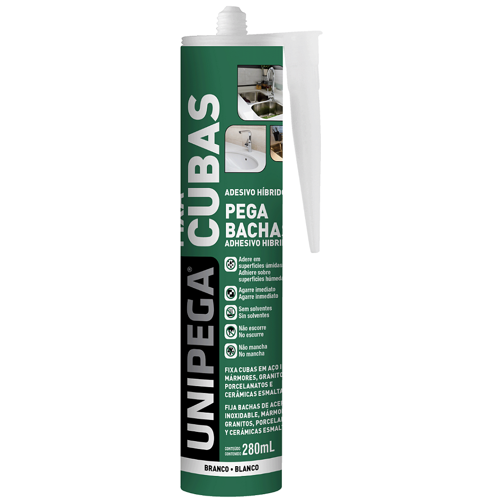 Adesivo monocomponente à base de polímero híbrido com silanos modificados para fixação de cubas, devido ao seu alto poder de adesão inicial e por não oxidar os metais.